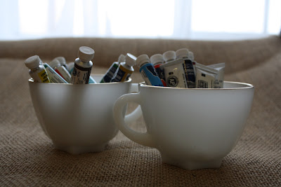 Painting in the studio can get very messing - in a fun way! This is how I organize my paints and other supplies when the paint is not flying. Simple, old-fashioned tea cups hold water color tubes. An antique, ceramic pitcher holds my brushes. An office supply organizer holds all of my acrylic paints - compartments separate the tubes by color hues. I embellished the organizer with a paper collage tag/label and finished it off with colorful yarn and glitter paint.